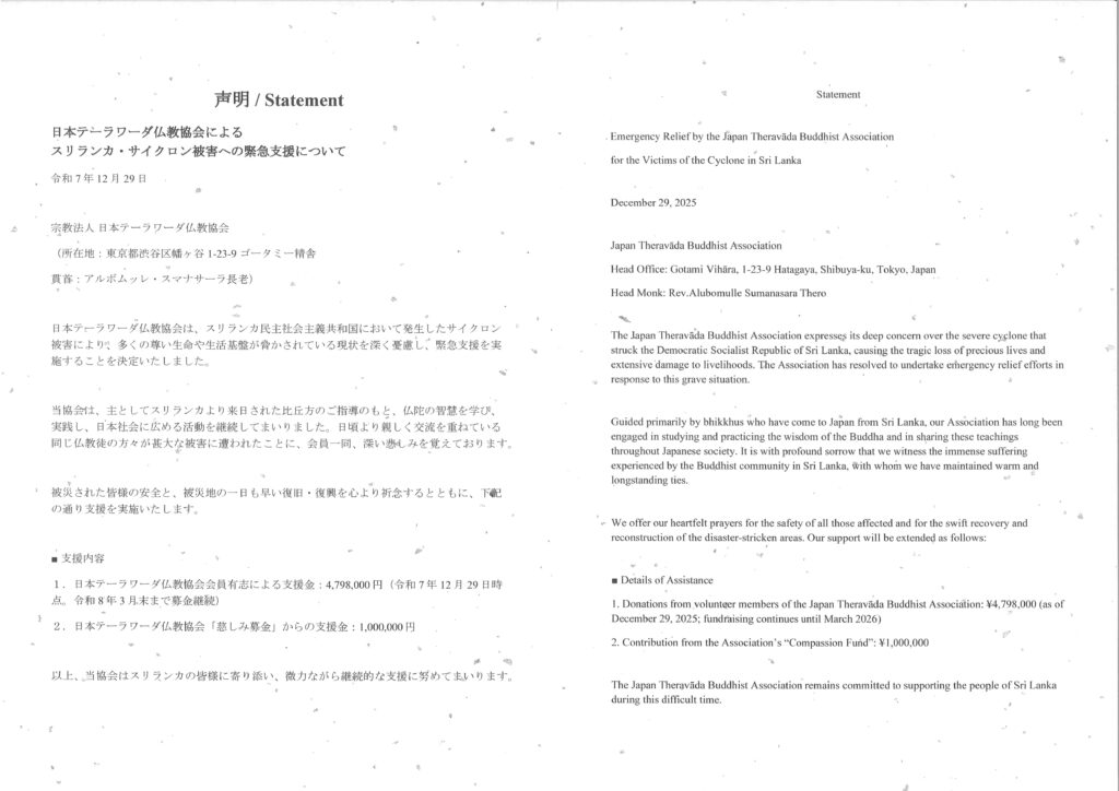 日本テーラワーダ仏教協会は、長年にわたりスリランカより来日された比丘方の指導のもと、仏教の智慧を日本社会に広める活動を続けてこられました。日頃より深い親交のあるスリランカの仏教徒コミュニティが直面している未曾有の困難に対し、協会一丸となって寄り添う姿勢を強調されました。